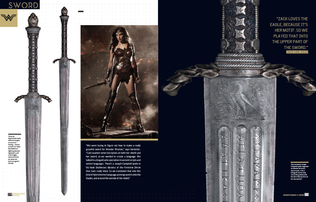 Uno de los detalles más interesantes es sobre la inscripción que se encuentra en la espada y escudo de Wonder Woman. El director Zack Snyder y Doug Harlocker hablaron con una lingüista que inventó un nuevo idioma y así pudieron hacer la traducción de una frase del libro de Joseph Campbell, Goddesses: Mystery of the Feminine Divine.