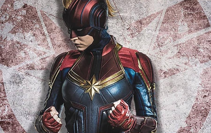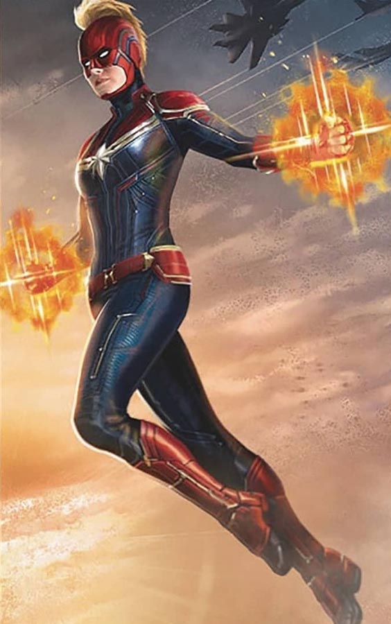 Hace algunas horas se filtraron algunas imagenes promocionales de Captain Marvel donde finalmente vemos a Carol Danvers con su clásico traje rojo, dorado, azul y su casco.
