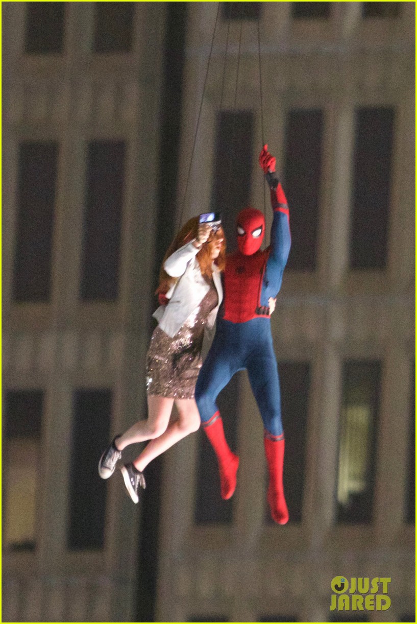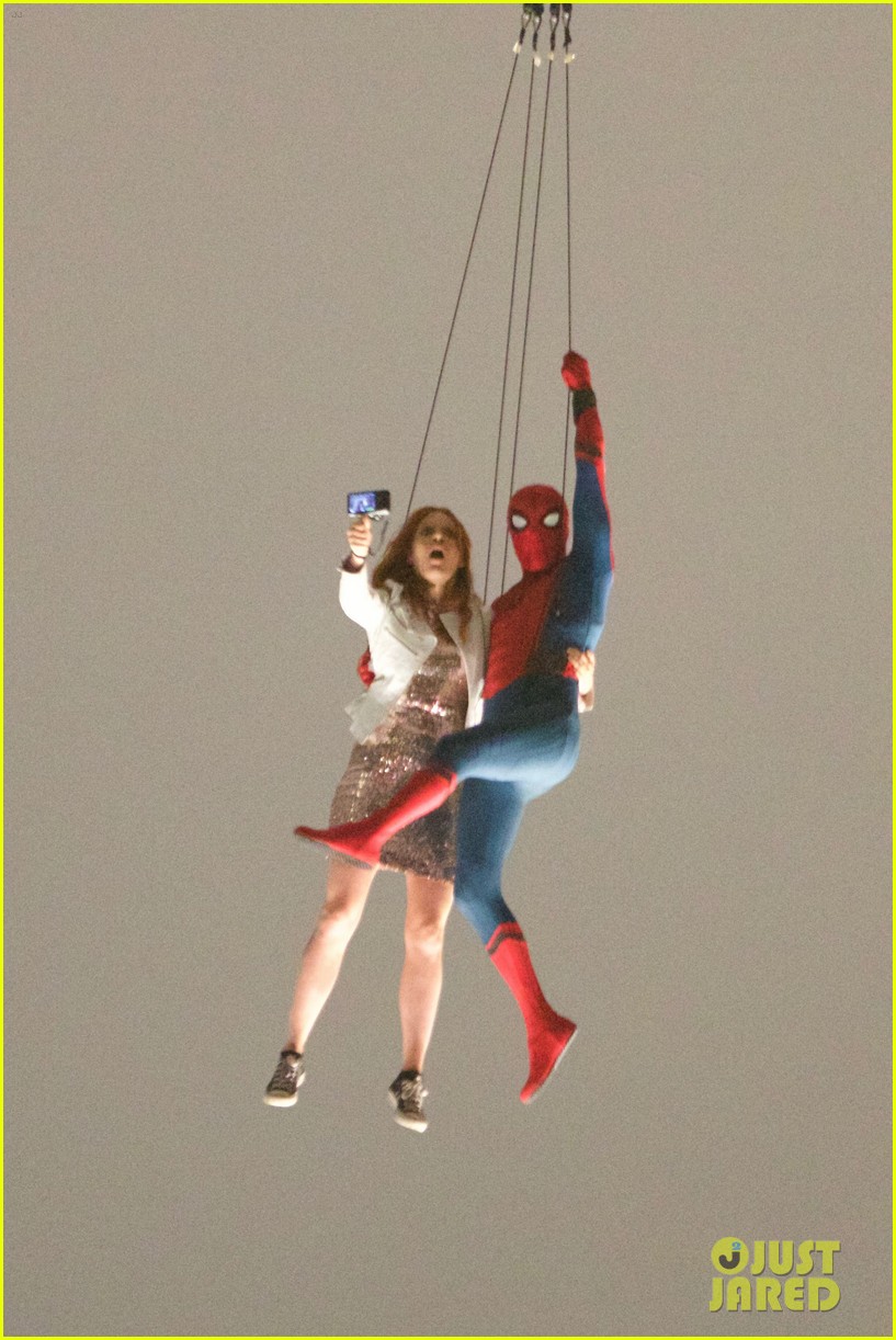 Ahora Just Jared rompe cualquier teoría conspirativa y nos revela a Spider-Man colgado del helicoptero junto a una mujer, presumiblemente, Mary-Jane Watson. Los dobles parecen estar tomando fotos mientras el helicóptero vuela alrededor de la línea del horizonte.
